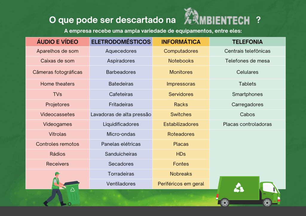Além disso, os resíduos tóxicos, presentes em baterias, placas e outros componentes, são destinados corretamente, evitando danos ao meio ambiente e à saúde pública.